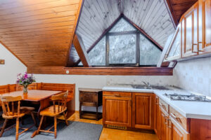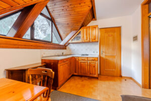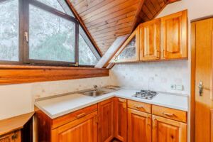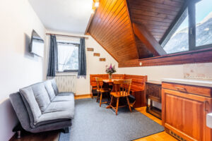 Wooden details and skylights create a warm and homely atmosphere, while also offering a stunning view of the surrounding mountains and forests. The apartment’s location is ideal for nature lovers, hikers, and winter sports enthusiasts.