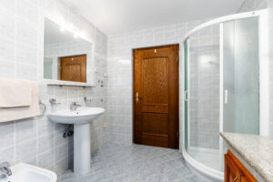 The bathroom is spacious and simply designed, allowing for comfortable and practical use. It offers all the essential elements for a carefree stay, including a large shower, a sink, and storage space for your personal items.