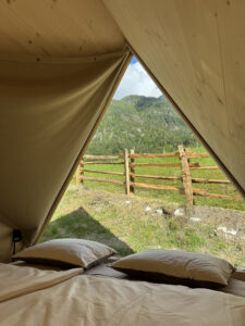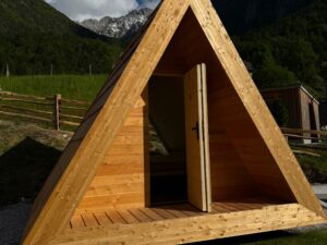 we invite you to experience a unique stay in nature by booking one of our charming wooden glamping huts. Each offers the warmth of natural materials, the comfort of a real bed, and stunning views of the surrounding mountains.